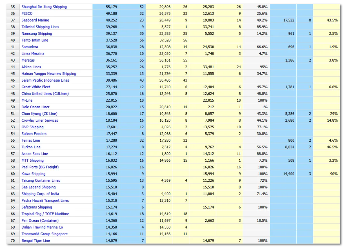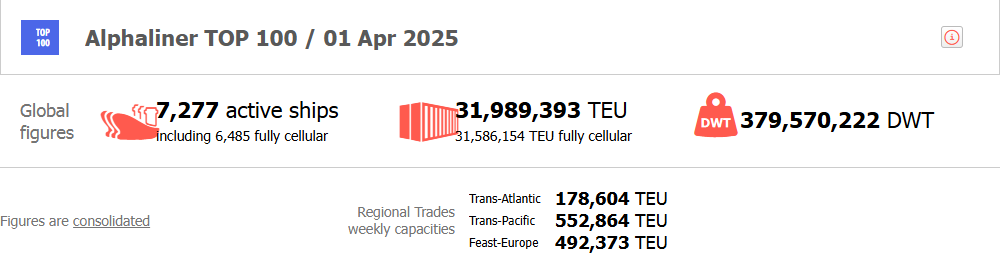 2025年4月1日,根據(jù)Alphaliner最新統(tǒng)計數(shù)據(jù)顯示,全球共有7,277艘集裝箱船舶,運(yùn)力達(dá)到31,989,393TEU,合計船舶載重噸為379,570,222DWT (DEAD WEIGHT TONNAGE 縮寫,載重噸)。