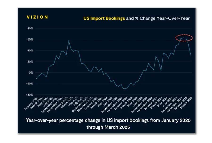 Vizion在題為“關(guān)稅沖擊波”的報告中指出,美國進口訂單在第一季度激增后,現(xiàn)已顯露出崩潰跡象。